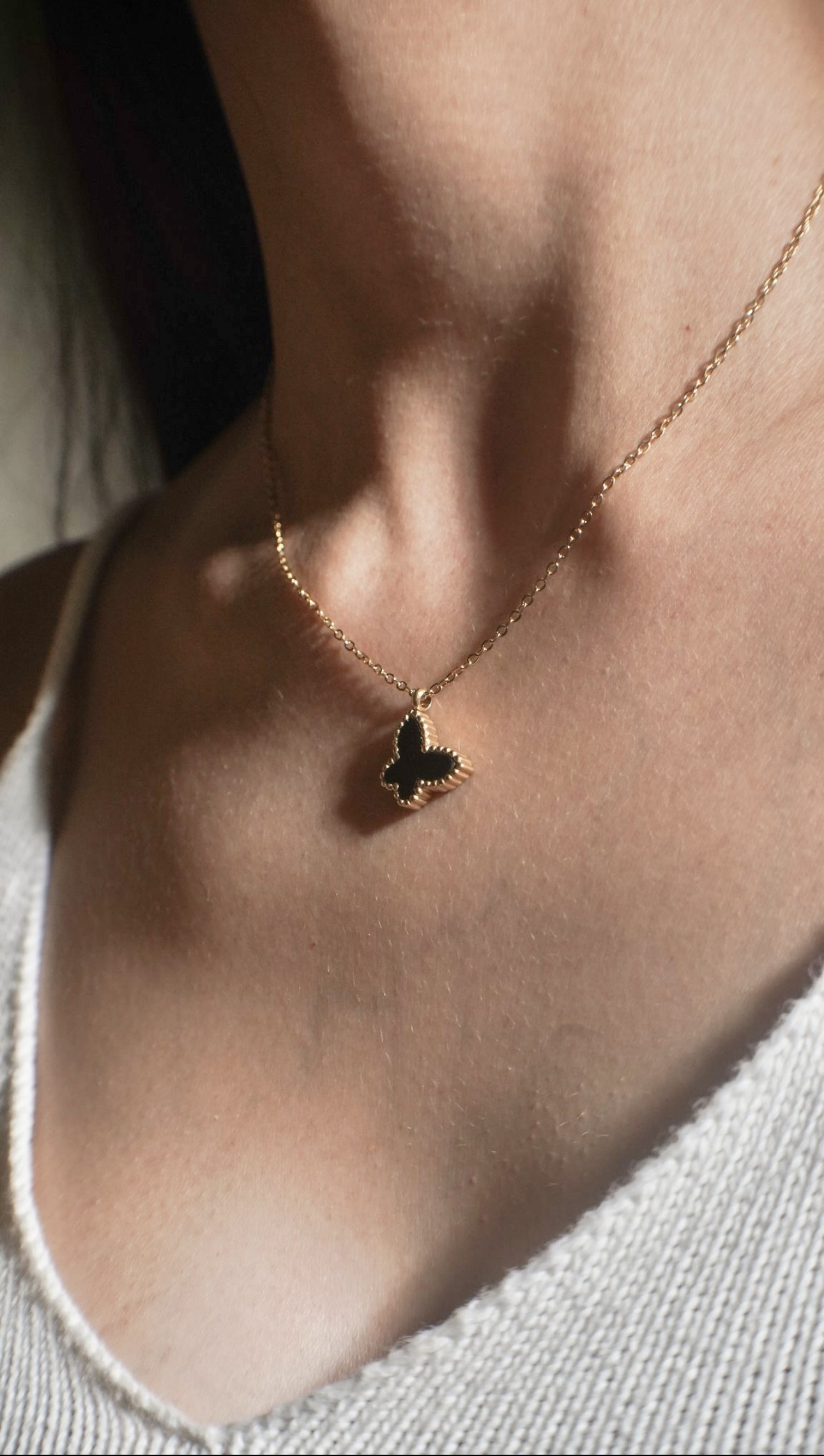 PEARL AND BLACK BACKGROUND BUTTERFLY NECKLACE